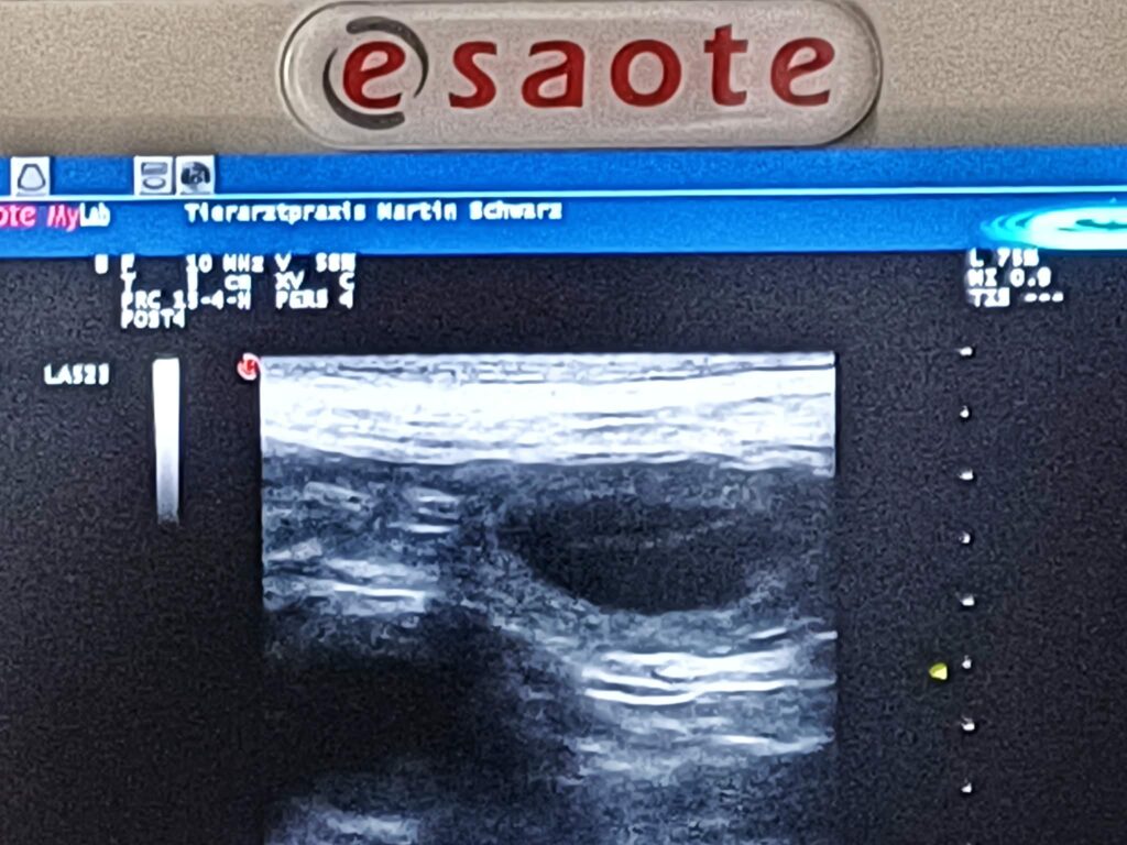 Beim Ultraschall sah man eine kl. Zyste (?) am Hodensack und fühlte diese. Man sah auch eine große Zyste im rechten Hoden. Ebenso einen kl.Tumor am Hoden, die Blasenwand war so dick das man mit dem Ultraschall nicht direkt in die Blase sehen konnte.
